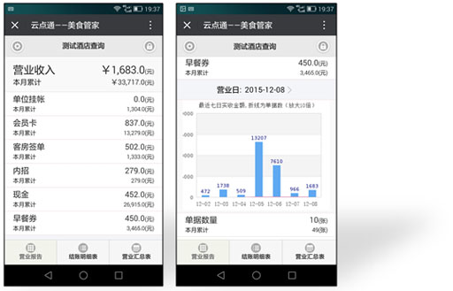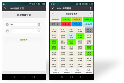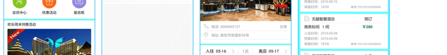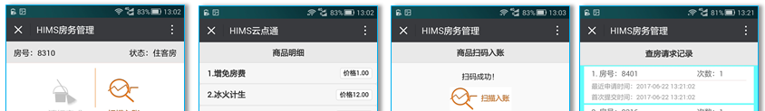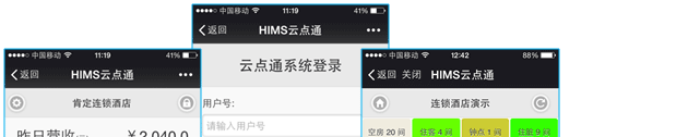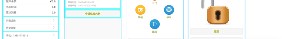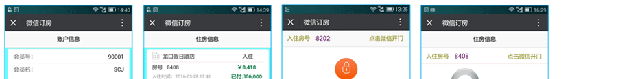 微信开门、微信退房微信订房后可以在我的订单里查看订单状态、微信支付、取消订单等操作,接待入住后可以在我的住房里看到入住的房间,点击房间可以微信开门、微信退房等;对于前台入住登记的散客也可实现微信开门和微信退房,方便、安全、快捷。 ![]() ![]() ![]() |